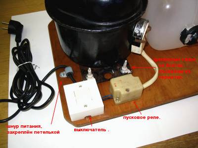 Компрессор закрепляется болтами, желательно трубками к краю листа фанеры, так в дальнейшем будет проще менять масло. Резьбу болтов при привинчивании желательно смазать герметиком, так они в последствии не будут откручиваться из-за вибраций. Рядом с ним шурупами привинчиваем пусковое реле, правильно его сориентировав. Дальше – выключатель света, на его контакты присоединяем реле и шнур питания. Сам шнур желательно закрепить хомутиком или петелькой к листу фанеры, так он не вырвется из выключателя.