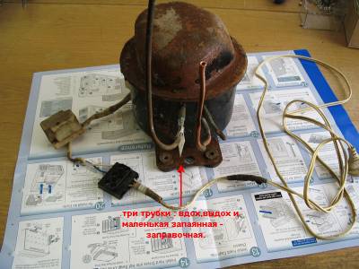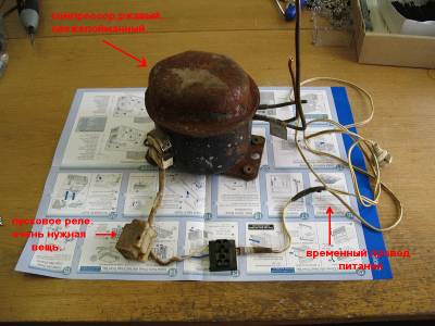 Итак, вы только что добыли свой компрессор, перемазанные грязью и маслом, с исцарапанными и оттянутыми до колен руками, уставшие но довольные наконец дотянули до его дома. Теперь можно приступать к подготовке компрессора к работе. Первое что нужно сделать - контрольный пуск. Одеваем разъём реле на контакты в корпусе компрессора. Ориентируем и временно закрепляем реле на горизонтальной поверхности, можно даже скотчем приклеить. Главное - закрепить реле так ,как оно стояло в холодильнике ,оно работает на прицепе земного притяжения и нагрева пластин. Если неправильно сориентировать его, или просто бросить на весу - оно не сработает правильно, и это может кончиться фатально как для реле, так и для обмоток мотора компрессора.