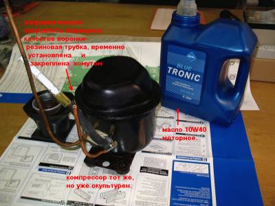 Добыча компрессора - процесс несложный, но надо к нему подойти внимательно и аккуратно, иначе в последствии могут быть проблемы. Первое что надо сделать - плоскогубцами или бокорезами откусить медные трубки, которые идут к решётке охлаждения, с припуском не меньше 10 см., а лучше – по максимуму, потом лишние трубки пригодятся (на некоторых типов компрессоров на трубках закреплена металлическая табличка с выбитыми цифрами - не выбрасывайте её, она тоже может пригодиться). Причём трубки надо именно откусить! Не в коем случае нельзя пилить, стружка обязательно попадёт внутрь, тогда ваш компрессор может сильно заболеть и умереть. При откусывании трубки заплющатся, можно этого не бояться, да и поможет не облиться маслом при транспортировке.