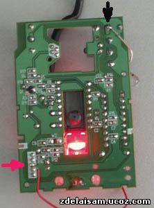 Припаял два проводка. Первый это питание +5 вольт, как потом выяснилось. Это средний провод из пяти что идут от блока, он красного цвета. Второй провод был припаян к кнопке левой клавиши. На фото видно что это левый контакт кнопки. Красный провод, это уже мой провод который идёт к моторчику. Он обозначен красной стрелкой.