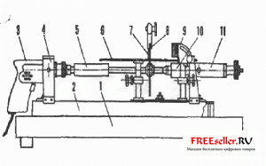 1- деревянная подставка, 2- П-обраэввя станина, 3- электродрель, 4 - неподвижная бабка, 5 - оправка пнлы, 6 - подъемный столик, 7 - пила, 8 - защитное ограждение, 9 - кронштейн с линейкой, 10 - вращающийся центр, 11 - задняя бабка.
