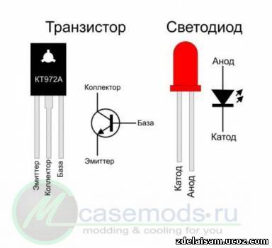 На рисунках предоставлены обе схемы, цоколёвка(расположение ножек) транзистора и светодиода, а так же монтажная схема.
