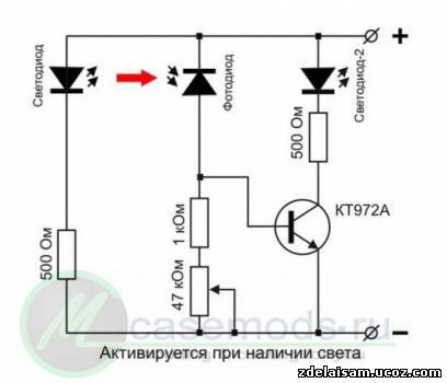 А это схема простого фотореле. Это устройство с успехом можно применить где Вам угодно, для автоматической подсветки лотка DVD, для включения света или для сигнализации от проникновения в тёмный шкаф. Предоставлены два варианта схемы. В одном варианте схема активируется светом, а другом его отсутствием.