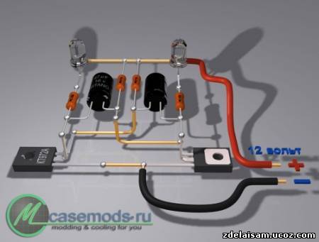 К выводам 5, 13 и 14 припаяйте провод плюса питания. Этот же провод припаивается к плюсу конденсатора 6800 мкФ. Отогнутые вниз выводы 3, 7 и 11 так же спаиваются вместе проводом, и этот провод припаивается к минусу конденсатора 6800 мкФ. Далее от конденсатора провода идут к источнику питания.