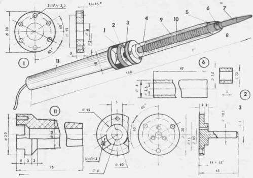 К ручке привинчивают шайбу и пропускают сквозь отверстие в ручке и шайбе шнур питания, свитый из трех изолированных гибких проводников Их пропускают сквозь три отверстия в основании и привинчивают его к шайбе, установив три втулки. Изоляцию в месте прохода через отверстия в основании следует дополнительно усилить двумя-тремя слоями стеклоткани. Один из проводов с помощью бандажа из голого медного провода присоединяют к хвостовику основания, этот проводник служит для заземления жала паяльника во время работы. Остальные два предназначены для подключения нагревателя к источнику тока. На нагреватель надевают защитный кожух и фиксируют его стопором, изготовленным из пружинной проволоки.