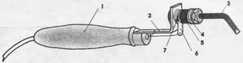 На рисунке 1 цифрами обозначено: 1 - шайба 2 - втулка; 3 - основание: 4 - колпачок; 5 - стеклоткань; 6 -трубка; 7 - жало; 8 стопор; 9 - асбестовая нить; 10 - нагревательная спираль; 11 - ручка.
