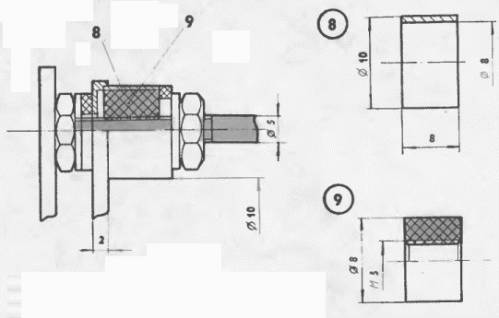 Особенностью второй конструкции (рис. 2) является устройство нагревателя, он изготовлен из графита и навинчен непосредственно на жало паяльника. По конструкции паяльник очень прост. Жало изготовляют из медного прутка диаметром 5 мм и нарезают на нем резьбу М5. На резьбу до упора навинчивают гайку и надевают металлическую шайбу (рис. 4). Затем надевают слюдяную прокладку толщиной около 0,5 мм и осторожно навинчивают нагреватель.