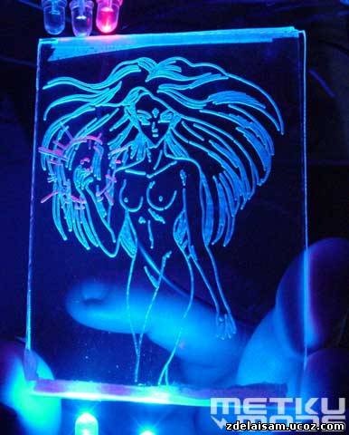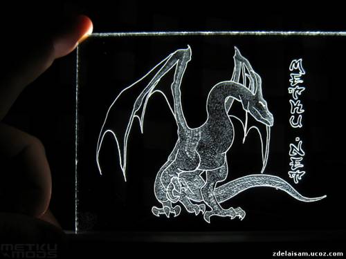 Впервые о многослойном изображении гравировкой по акрилу Japala заговорил еще в 2002 году. Тогда он сделал пробный проект – силуэт девушки в стиле аниме с мигающим красным шаром. Сама девушка была выгравирована на одном слое, шар – на другом.