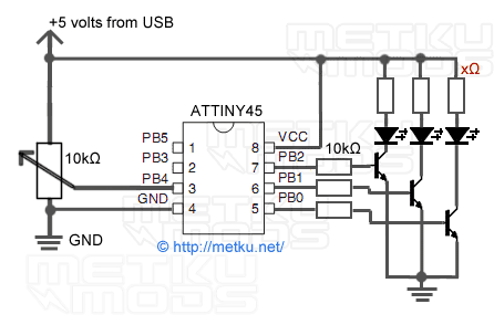 Japala использовал микросхему ATtiny4 от Atmel. Она включает несколько светодиодов по очереди. Но эту вещь моддер применил только для проверки. Было принято решение о создании своей схемы.