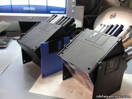 Но ручек становилось всё больше и хотелось сделать ещё более удобную подставку. Достав специально купленную коробку дискет я решил сделать подставку, стоящую под углом. Методика была та же, что и в самый первый раз — коробка с днищем из дискеты или картонки (для оригинального вида), разделители из дискет, но сбоку были прицеплены ещё два диска, которые держат подставку под углом. В первый раз я использовал маленькие саморезы, но даже с ними успел намучатьсяя, во второй — приклеил их. Подставки получилась