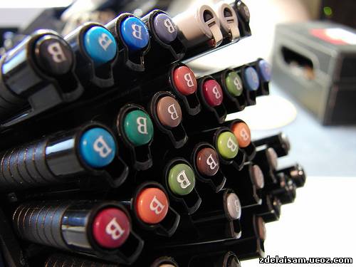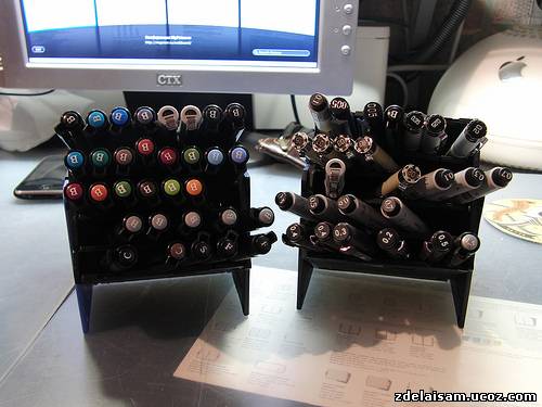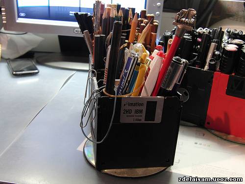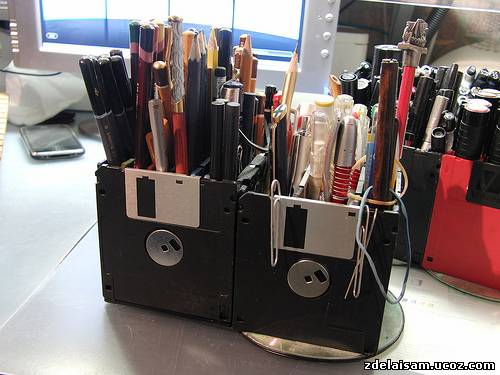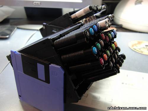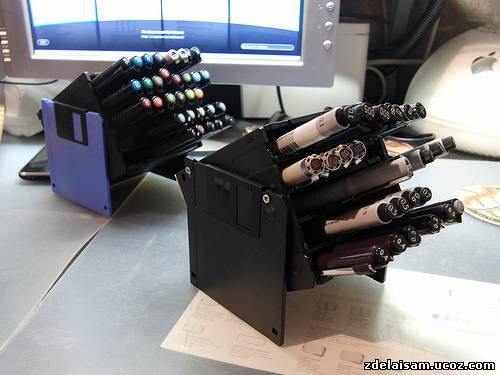 Рисовать я люблю. Маркеров, ручек и карандашей у меня великое множество, и в какой-то момент я понял, что обычных подставок и пеналов, коих много в канцелярских магазинах, мне не хватит. Хотелось чего-то своего и подогнанного под свои нужды. Началось всё с того, как я прочитал пост на лайфхакере о подставке для ручек из дискет. Делается она очень просто — берется пять дискет и сцепляется кольцами друг к другу. Я усовершенствовал схему и не сцеплял их, а склеил. Сделанная по этому методу подставка была позднее модифицирована добавлением крышечки на скотче в коробочку для ластиков.
