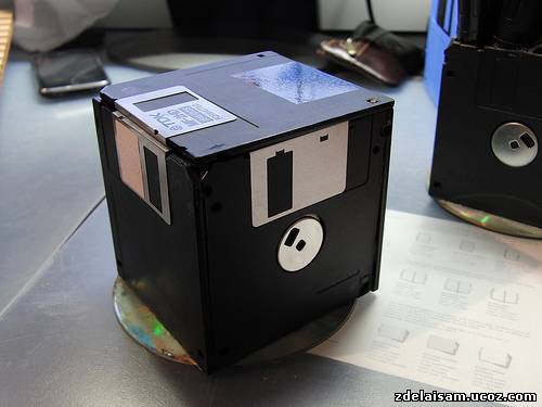 Одной подставки не хватило и я сделал ещё одну, заменив нижную дискету компакт-диском, это увеличило стабильность, да и выглядит это дело неплохо. Позднее я сделал ещё одну подставку по старому методу и склеил её с новой, дополнительно добавив внутрь несколько перегородок из таких же дискет. Уже два года верой и правдой она мне служит на столе.