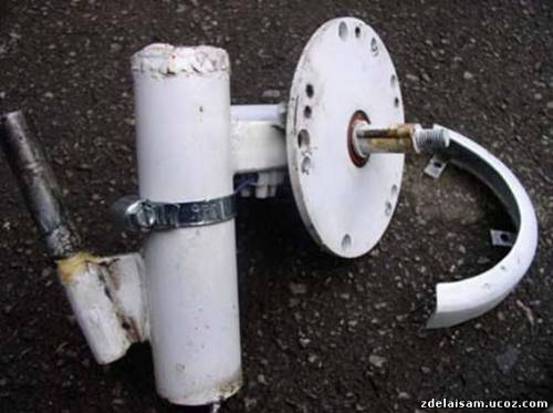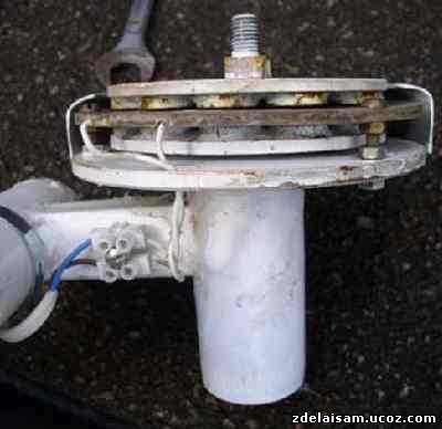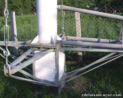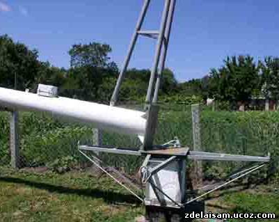 Но когда занялся вплотную, оказалось все не так просто. Литературы подходящей не нашел. Долго не мог определиться с генератором, не знал, как правильно изготовить лопасти, какой редуктор применить, как защитить от урагана и т.п. Как говорится, варился в собственном соку. Но знал, что если очень хочется, то все получится. Неспеша делал мачту. На чермете подбирал подходящие куски труб, начиная с диаметра 325 мм по 1,5 м длиною (чтобы помещалась в багажнике моей машины). Взамен сдавал металлолом. Получилась мачта длиной 12м. Для фундамента привез бракованный фундаментный блок от высоковольтной опоры. Закопал его на 2метра в землю и 1м остался над землей. Затем обварил его двумя поясами из уголка, к ним приварил кронштейны. На концы кронштейнов к анкерным болтам приварил «пластинки» из 16мм железа размером 50 х 50 см, соединенных между собой мощными петлями. Купил на рынке мягкие 10 мм тросы и талрепы, все анодированное, не ржавеет. Сварил и закопал анкер под съемную лебедку. Лебедку тоже пришлось делать самодельную, используя готовый червячный редуктор. Кроме того, установил П-образную подпорку высотой около 2м, на которую должна ложиться мачта. Так как спешить было некуда – мачта делалась без спешки и поэтому получилась, на мой взгляд, красивая и надежная.