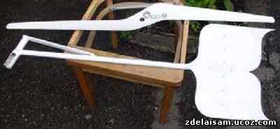 Просто на ней нарисовал двухлопастный пропеллер и выпилил электролобзиком. (Из этого же куска я еще выпилил три лопасти длиной по 1м для ветряка на автогенераторе, и еще как видите осталось). Переднюю кромку лопастей я заокруглил "на глаз" радиусом, равным половине толщины дюрали, а зднюю заострил с фаской приблизительно 1см на концах и до 3см к центру.