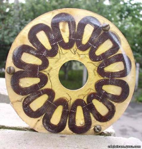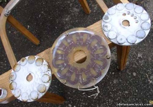 Для изготовления статора намотал 12 катушек эмальпроволокой диаметром 0,5мм по 60 витков на катушку (взял проволоку с петли размагничивания старого негодного цветного кинескопа, там его достаточно). Распаял катушки последовательно конец с концом, начало с началом и т.д. Получилась одна фаза (боялся, что будет маловато напряжения). Выпилил из 4 мм фанеры форму, натер ее воском.
