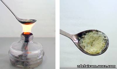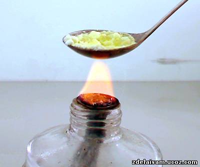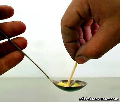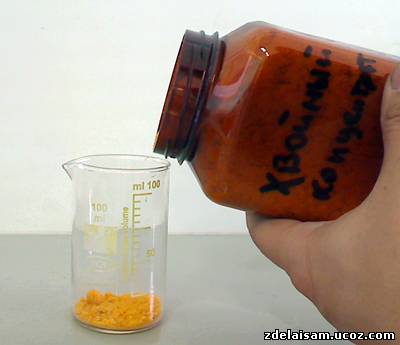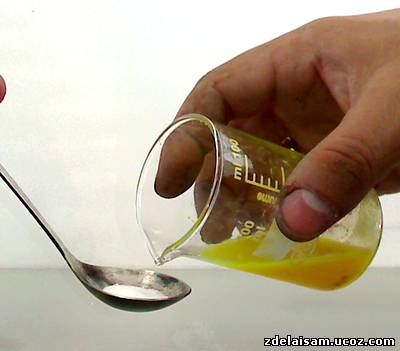 Охладим, добавим еще раствора красителя и снова прокипятим расплав. Получится однородное желтое вещество.