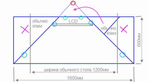 Из обрезка вырезается дальний угол стола и укладывается на две шайбы прикрученные к столешнице снизу (зеленые на схеме) и шуруп вкрученный в стену (красный). Из другого обрезка можно сделать полочку.