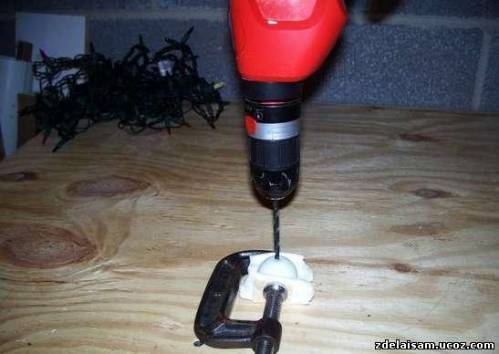 Сверлим отверстия в шариках до лампочку. Внимательно - шарик вещь хрупкая.