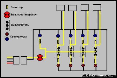 Второй вариант: Можно обойтись одним рядом светодиодов и выключателями без нейтрального положения: