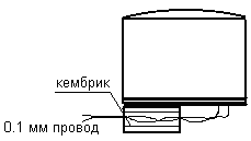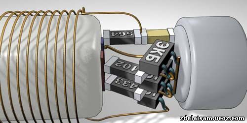 Теперь берём катушку (Рис.10) с ранее упомянутым эмалированным проводником и наматываем 70-100 витков на оставшееся свободное место на ТЭМе-1958 и согласно схеме припаиваем её концы к платам. Для надёжности можно капнуть на катушку немного клея. Использование проводника с большим диаметром может привести к самовозбуждению наушника (высокочастотный писк).