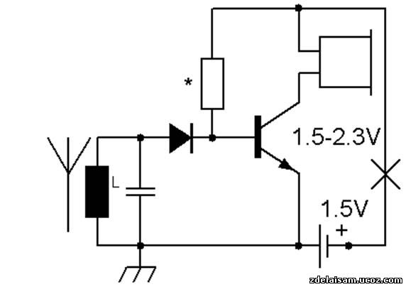 Усилитель передатчика №2. Проще уже не бывает. Разница в том что придется мотать катушку на сопротивление указанное на схеме. (вместо динамика)