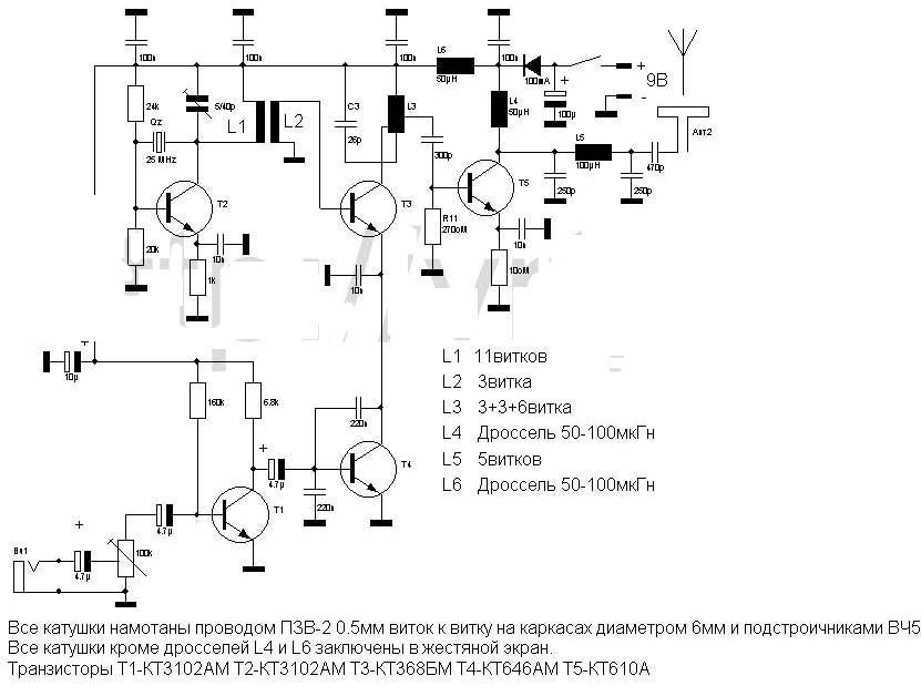 Схема довольно проста это просто передатчик с АМ модуляцией настроенный на частоту 25 мГц. Он состоит из усилителя звуковой частоты модулятора и самого генератора высокой частоты.