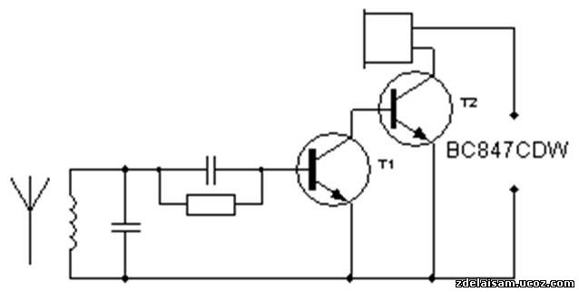 Как видно из схема это обычный НЧ усилитель с непосредственной связью (связями) катушка подключена через разделительный конденсатор. Все транзисторы в нашем варианте были выбраны вражеские в основном из за миниатюрного корпуса типа СОТ-323 они называются ВС847. Можно применить любые другие звуковые маломощные даже структура не имеет значения только типоразмер. (В случае изменения структуры транзисторов просто изменить полярность питания устройства.)