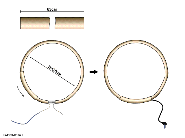 Она проста для ее изготовления потребуется. Провод диаметром 0.33 мм или около того. Лучше взять гибкий монтажный, чем он будет мягче, тем лучше. Также нужна термоусадочная трубка близкая к цвету одежды или телу. Но это не обязательно можно просто блеклых тонов. На оправке (кастрюля банка или еще чего) 20 см в диаметре отмеряем отгибанием термоусадочную трубку и обрезаем. Тоже делаем, я скалистой проволокой толщенной около 1-2 мм продеваем ее в терма трубку и привязываем к одному ее концу наш провод любым удобным методом. Это будет импровизированной иглой. Теперь отмеряем кусок провода, измеряя его сопротивление оно должно быть около 16нном. Теперь начинаем продевать провод по кругу зазор между концами трубки. Когда все готово у вас получится кольцо диаметром 20 см с не менее чем 40витками провода. Усаживаем трубку теплым воздухом и зачищаем два конца подпаивая к ним кусок экранированного провода от неисправных наушников для плеера, хорошо, если разъем на проводе он, потом пригодится, так как можно не собирать усилитель, а подключать антенну к плееру приемнику итп. На место соединения (пайки) надеваем кусок трубки 5-8 см с учетом, чтобы трубка закрыла пайку и в нее вошли сложенный в двое виток антенны. Передатчиком этой антенны может служить любой звуковой усилитель мощности более 50 мВт и способный работать на нагрузку 8-16 ом.