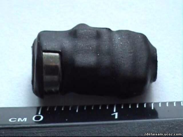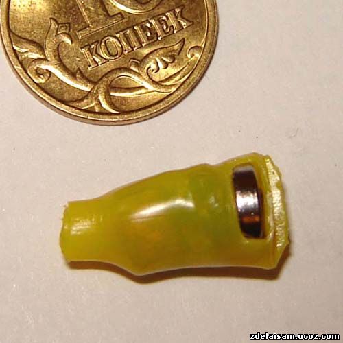 Теперь необходимо приклеить к основанию магнит. Простой магнит тут не покатит, нужен очень мощный и его добывают из посыпавшихся винчестеров. Одного магнита оттуда хватит на уйму наушников. Добытый из самого святого места компьютера магнит крошится!!! кусачками на кубики размером согласно масштабу (2х2х2 мм) приведенных рисунков. Один из получившихся кубиков ( кубики в первый раз получаются примерно после 10-20 минут крошения ) приклеивается !!!!!!внимание!!!!!! южным!!!! или !!!!! северным!!!полюсом к основанию. Определить где какой полюс можно с помощью какого-нибудь магнита из раздолбанного китайского наушника. Приклеиваются суперклеем. Главное не заклейте два отверстия на основании.