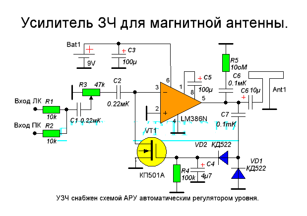 Усилитель ЗЧ более качественный можно собрать на одной дешевенькой микросхеме и четырех дискретных элементах. Надеюсь не надо пояснять, что мы включим вместо наушников? Да правильно катушку передатчика вяло свисающей с шее.