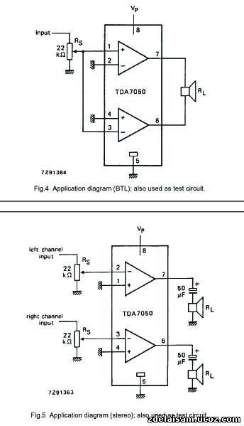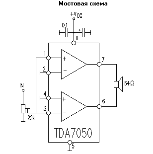 Для петли использовал микросхему в обычном корпусе. Схема включения похожа на стерео (нижняя), только соединил вместе 2ю и 3ю ноги, а 7 и 8 раздельно идут на конденсаторы. Но после них не на 2 динамика, а соединяются вместе и на петлю (чисто на слух так звук помощнее, чем использовать моно-вариант т.е. верхную 1-ю схему), второй конец петли естественно на минус.