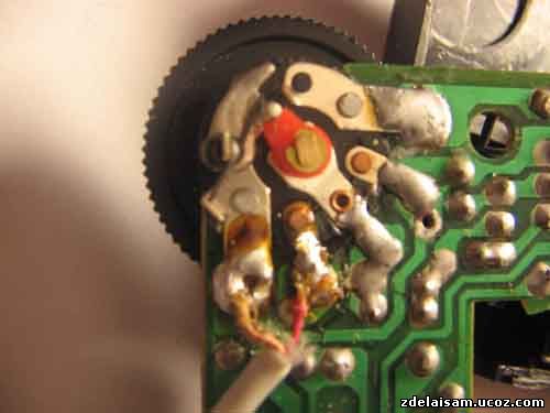 в). Находим переменный резистор, который является регулятором громкости и включателем. Два крайних его контакта идут к hundsfree вместо наушника (см. фото_1).