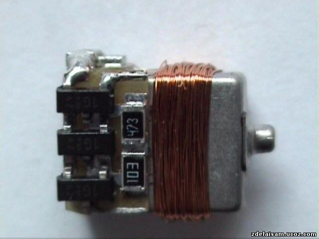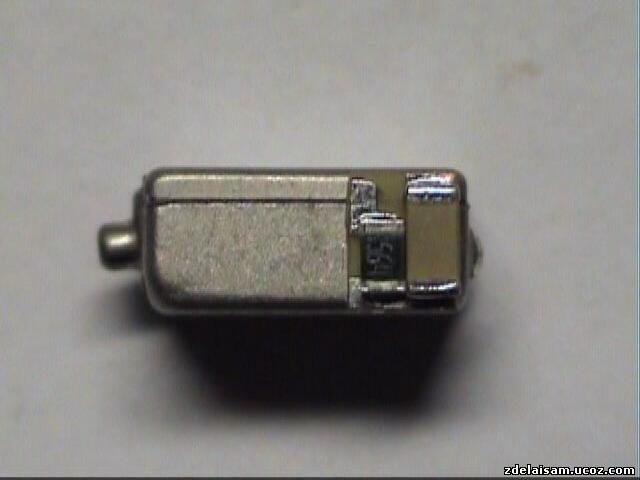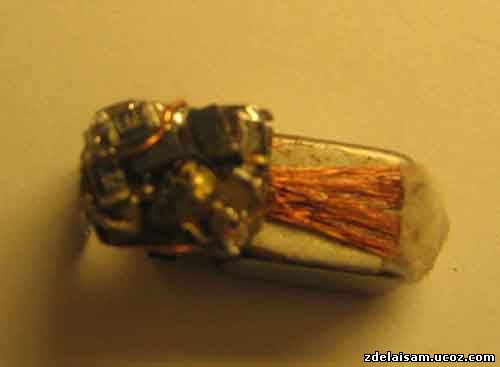 Пожалуй самая главная часть: катушка намотанная прямо на микросхему, закрепленную на динамике. Паялось всё 45 ватным паяльником, т.к. особо сложного ничего нет и мелких деталей тоже: только микросхема и динамик от нокиа, ну и катушка естественно.