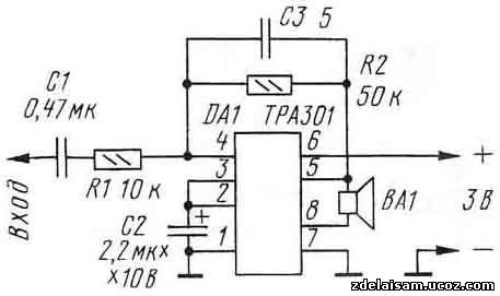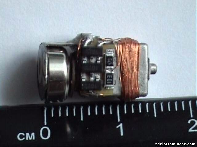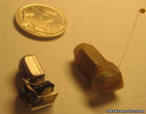 В самом наушнике использовал микросхему в СМД корпусе. Динамик взял от нокиа (тот что 60 Ом вроде). Собрал по первой схеме, но только без всяких резисторов и конденсаторов, т.е. на вход подключил катушку (без конденсаторов и резисторов!!!), которую намотал на микросхему.