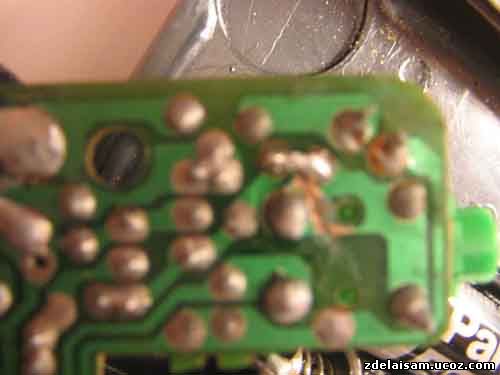 б). Находим гнездо для наушников. Находим ножку гнезда, которая подает сигнал на средний контакт штеккера(если штеккер стерео). Находим дорожку которая идет от этой ножки и обрезаем ее. Вообщем гнездо будет приспособлено для моно штеккера. Туда будет втыкаться антенна одеваемая на шею.