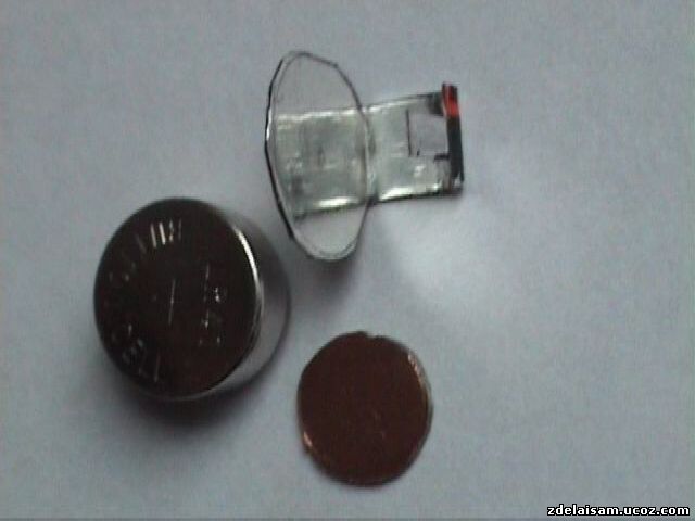 Для изготовления фассунга для батарейки используем жесть (можно снять со старой батарейки) и материал для изготовления плат. Из жестянки вырезаем основную часть корпуса фассунга (которая так же является клемой «+») см. рис.12 из материала для изготовления плат вырезаем круг диаметром 6 мм и опять же берём наждачку и сошлифовываем поверхность и, без того кровоточащие, пальцы до минимума, это у нас получилась клема «-». В итоге фассунг выглядит подобным образом cм. рис.13.