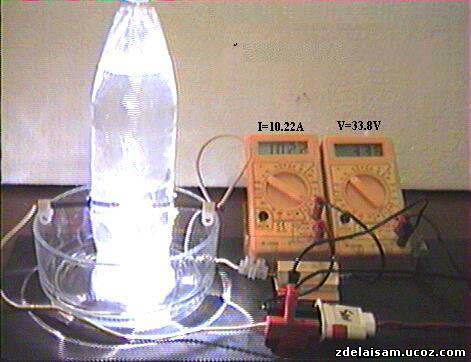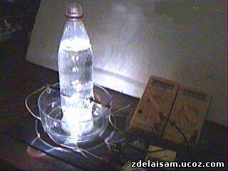 1) Высверлить два диаметральных отверстия (10 mm диаметр) в 60 mm от основания бутылки и