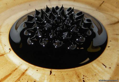 Ферромагнитная жидкость - жидкость, сильно поляризующаяся в присутствии магнитного поля. Иными словами при приближении обычного магнита к этой жидкости она начинает вытворять определенные движения: вскакивает как ежик, липнет к магниту, поднимается горбом.