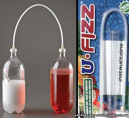 Как видно из рисунка две бутылки надежно соединенные трубкой. Обратите внимание, что во второй бутылке куда будет наливаться наша газируемая жидкость трубка идет до самого дна, а в первой где будет идти реакция - трубка чуть выглядывает из под крышки.