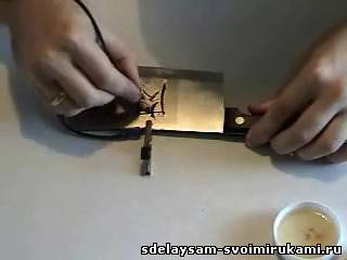 Все приготовили, начинаем электрохимическую очистку поверхности металла. Для этого необходим присоединить "+" к тесаку, а "-" к гвоздю на который надета головка от ватной палочки - это и будет наш электрод.