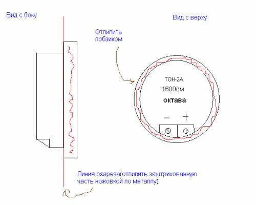 -Зажимаем в тиски динамик и спиливаем ножовкой по металлу края с резьбой и немного округляем напильником для красоты (чтоб за струны не цеплялись)