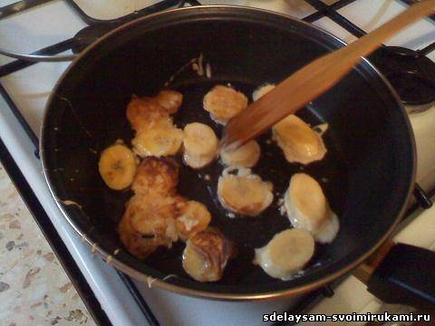 Обмакиваем наши кусочки банана в кляре и кладем на разогретую сковороду. Обжариваем с обеих сторон.