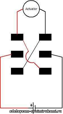 Питается мотор от напряжения 12 вольт. Схема переключения положения вверх-вниз проста и стара как мир: