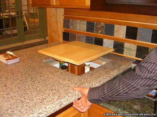 Забавная, а что самое главное - полезная самоделка. Ничто, нигде не мешается. Пришли гости или захотелось пропустить стаканчик аперитива перед обедом - нажми на кнопку и все появится!