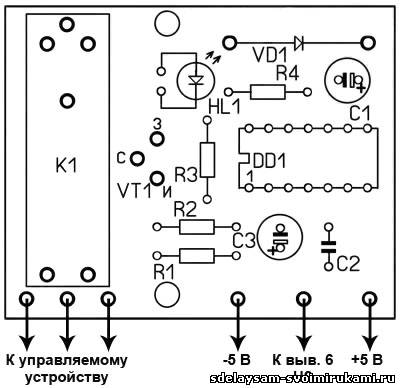 PS: Меня мучил вопрос: где же взять питание для этой схемы? Не отдельную же линию вести? Вот где можно найти выход так это в двойной проводке. Если у Вас проводка в потолке рассчитана на две лампы, а у выключателя две кнопки ответ пришел сам собой - одной кнопкой управляет устройство, а от второй питается, скажем, через зарядку от мобилы (она экономична).