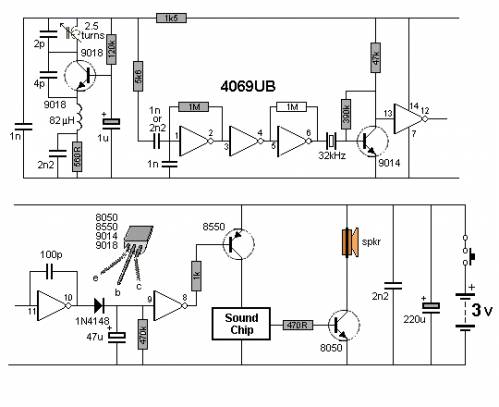 Звонок. Приемник собран на одном транзисторе по схеме регенеративного детектора. Принятый с него сигнал поступает на операционный усилитель. Далее сигнал попадает в ЗВУКОВОЙ ЧИП. Не сложно догадаться, что он и является формирователем мелодий, которые мы слышим. С него на усилитель мощности, собранным на одном транзисторе, и в динамическую головку. Все, хочется только отметить сравнительно небольшой ток потребления в дежурном режиме.
