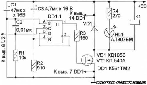 Это обычный триггер. При поступлении на него импульса со звонка он переключается в одно из фиксированных положений. На выходе у триггера - реле, а уж к реле подключено управляемое устройство, в нашем случае это лампа накаливания.