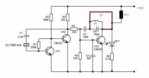 Кнопка. Три транзистора, батарейка на 12 вольт. Генератор высокой частоты собран по схеме емкостной трехточки, усилитель-преобразователь. Преобразует от частоту порядка 433 МГц. Что меня удивило, так это параллельное включения двух контуров, один настраивается на первичную частоту генератора, а второй ловит где-то 10 гармонику и возбуждается на частоте 433 МГц. Наши китайские друзья опять нашли оригинальное, а главное простое решение проблемы используя минимум деталей.