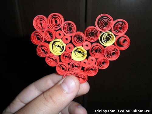 Полностью заполните сердце элементами и склейте тем же клеем между собой. После того, как вы склеили все элементы, оставьте сердце высохнуть, а затем уже можете подарить. Хочется заметить, что вы можете использовать бумагу любого цвета и делать различные фигуры разных размеров.