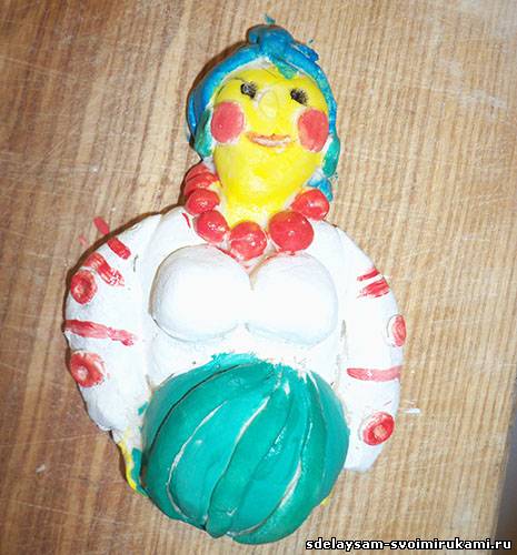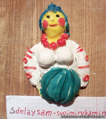 Как сделать такой эксклюзивный сувенир – славянскую женщину с арбузом? Первым делом лепим лицо. Отрываете небольшой кусочек теста, скатываете его в шарик, придавая форму головы. С более крупного создаёте туловище. К нему крепите руки. Голову украшаете, как нравится – платок, коса, венок или шляпка. В руки помещаете круглый шарообразный комок теста и украшаете его полосами. При помощи зубочистки вырисовываете глаза, рот. Мелкие летали, например бублики, создают из сплющенного шарика, по центру которого ставят оттиск карандашом.